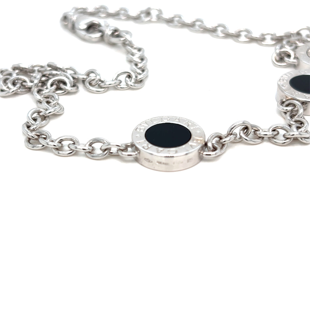 Elegant and iconic Bulgari Bvlgari Bvlgari necklace crafted in 18k white gold, featuring a series of reversible double-face elements: one side adorned with brilliant-cut diamond pavé, the other polished in rich black onyx. This versatile design allows you to wear the necklace showcasing either the sparkling diamonds or the sleek onyx, depending on your style.